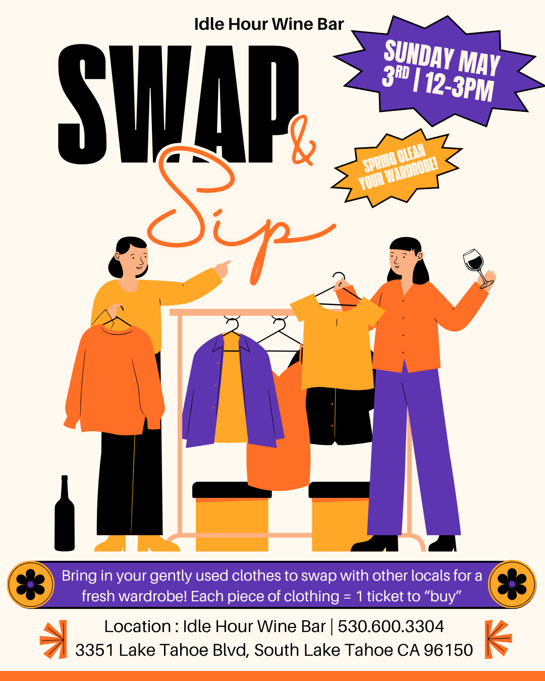 Bring in your gently used clothes to swap with other locals for a fresh wardrobe! Each piece of clothing = 1 ticket to “buy”
